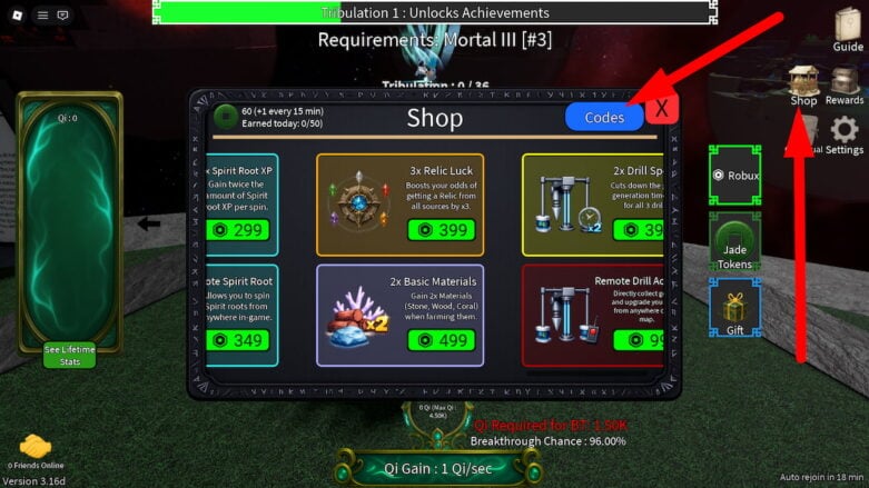 - Press the Shop button on the right of the screen, then press the blue Codes button.