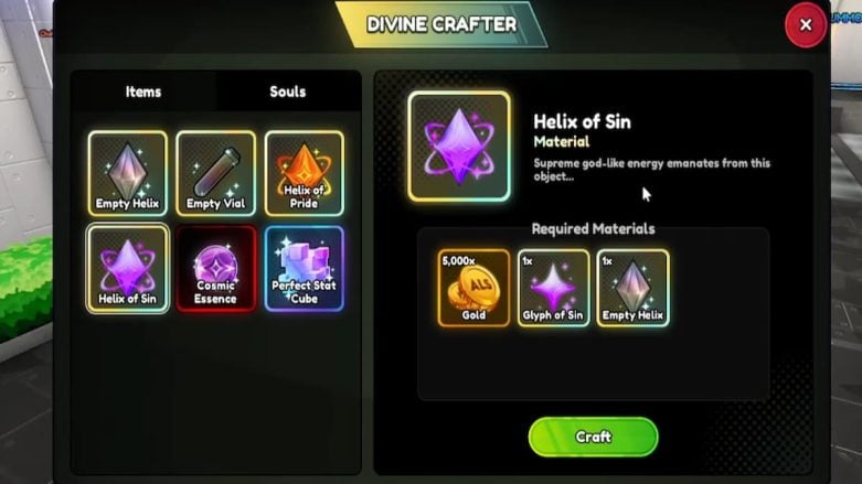 To get the Helix of Sin, you must interact with the Divine Crafter in the lobby of World 2 in Anime Last Stand. After that, click on the Helix of Sin, which will give you a list of required items.