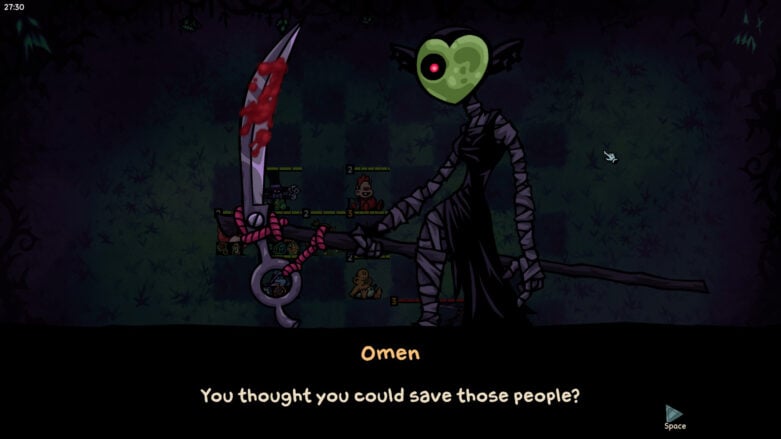 Each character can get to level three, which greatly upgrades them and turns them into the powerhouses you build your entire party around. However, XP and levels are sort of just handed to you, not earned. XP is given after each battle, but you can only fight a certain amount of them per stage before you have to fight the boss and move on, turning the level-up system into more of a finite currency, of which you’re given the same amount in each run. It’s not a reward for choosing to take extra battles, and it often is more valuable as a tool used to reroll rather than level up your characters.