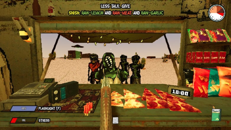 Instead, Wasteland Bites falls into the genre of highly stressful time-management horror games, which were popularized by the breakout success of the Five Nights at Freddy’s franchise in the 2010s. The gameplay loop involves preparing food for guests, making sure to get the order right from the myriad of ingredients available to you, while managing various threats that gradually increase your stress levels when they appear. A full stress bar means death, and such threats can include mimics, hostile guests, barking dogs, a grease fire, Nosferatu himself, or worse. The challenge of filling out an order in time while shooing away rats and preventing alien abduction is not one you should take lightly, and it creates a constant sense of barely controlled chaos.